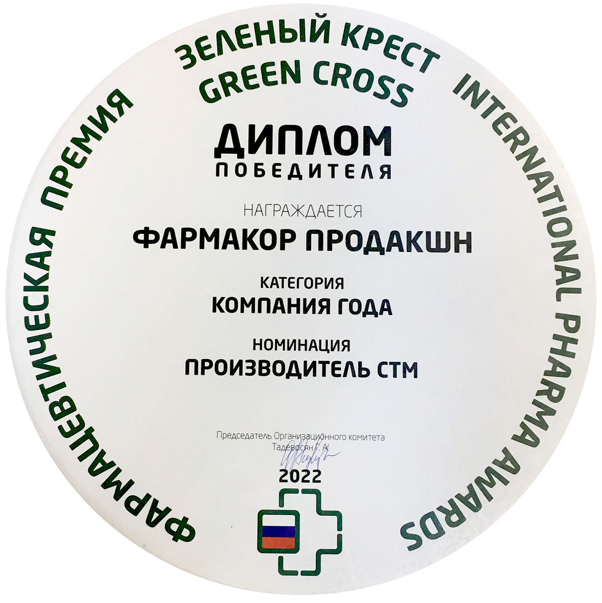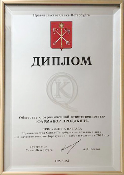 В 2021 году компания «ФАРМАКОР ПРОДАКШН» стала лауреатом конкурса наград правительства Санкт-Петербурга — «Сделано в Петербурге» и «За качество товаров (продукции), работ и услуг».