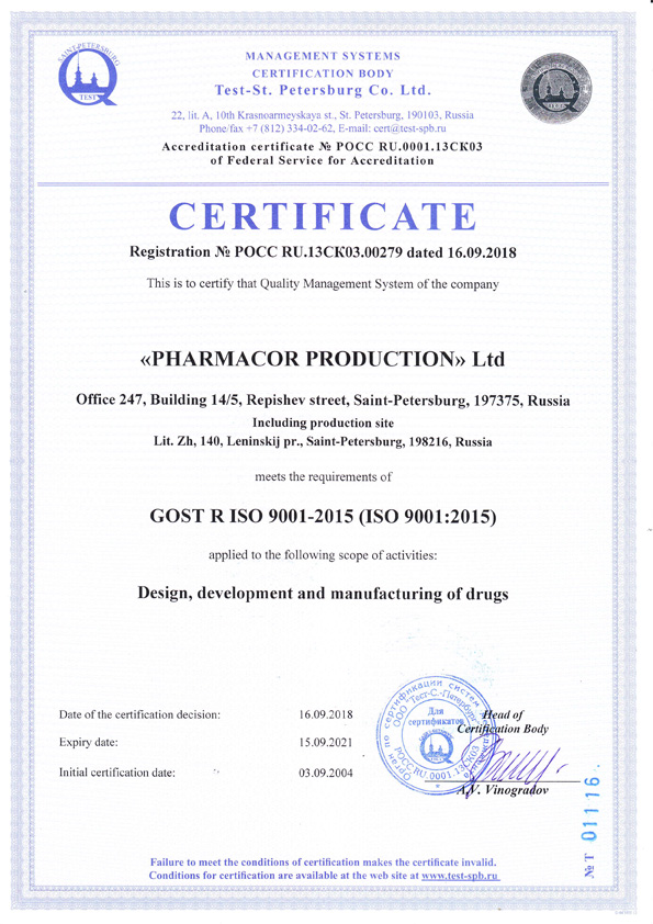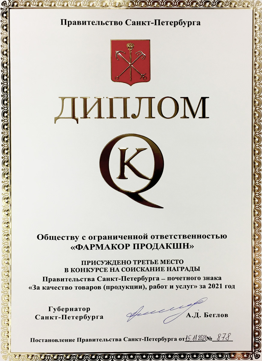 In 2021, the company "Pharmacor Production" became a laureate of the St. Petersburg government award competition - "Made in St. Petersburg" and "For the quality of goods (products), works and services."